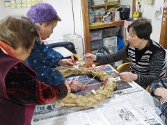 作り途中のしめ縄を、最後の締めでお飾りを飾ります。