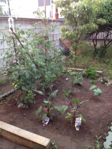 雨の日で、和が家の家庭菜園も野菜が台風に倒されないように