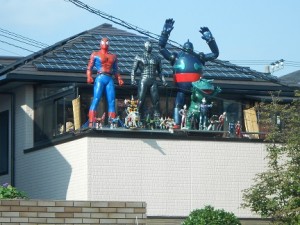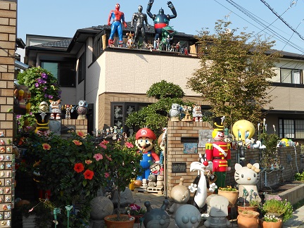 ベランダに何体もフィギュアが。
