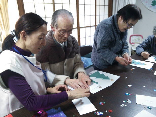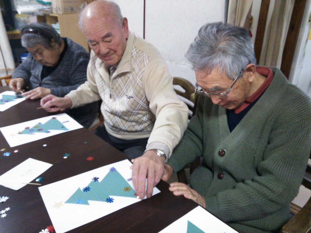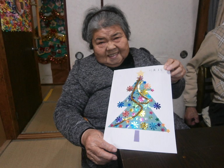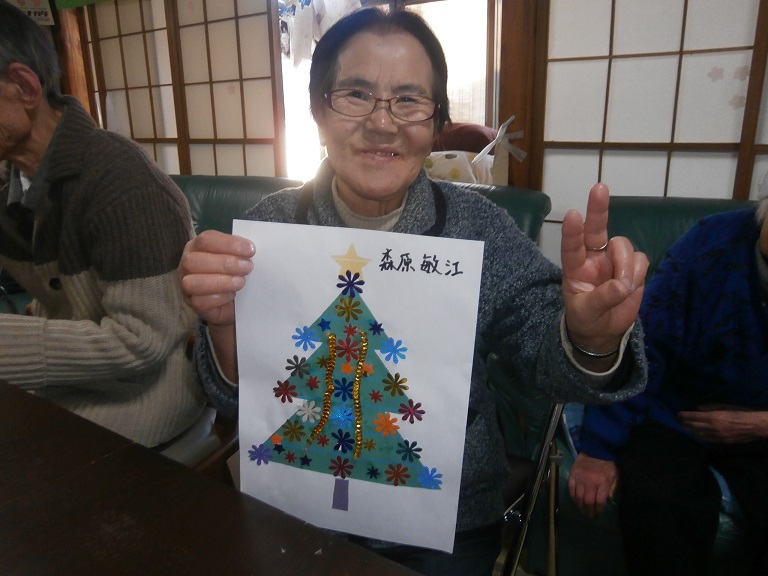 本日は12月25日・・・楽しみにしていたクリスマスの日ですヽ(^。^)ノ 今日は、クリスマスツリーのクラフトを作りました☺ 皆様、とても丁寧に綺麗に作られていましたよヽ(^。^)ノ出来上がりはこちらです(^^)・・・ 出来上がりに満足した表情がみられました(^^♪ その後はクリスマス会をしました(*^_^*)、サンタさんがわが家に来てプレゼントをして下さったりスタッフの子供がきてクリスマス会はとても盛り上がりました(^○^) 突然の・・・サンタさんからのプレゼントだったり、子供達のまさかの登場には皆様驚きが隠せない様子でした(゜_゜>) 本日も、とても良い思い出となる一日でした(*^_^*)