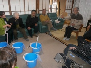 新聞を丸めて槍を作り、点数の入ったバケツに上手に入れる、