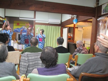 途中、ボランティアさんが利用者様に声を掛けて下さり、利用者様いざ!!ステージへ!!、「炭坑節」「好きになった人」等の歌に合わせ身体を動かし踊られていましたヽ(^。^)ノ皆様とても、楽しそうでしたよ(*^^)vボランティアの皆様ありがとうございました!(^^)!