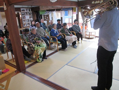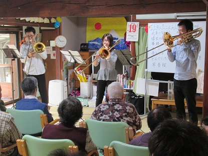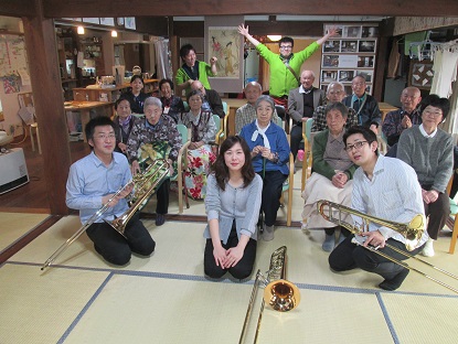 トロンボーンの音に、私本当にはまりました(;O;)もの凄く聞いていて心地よく、その中に迫力有!驚くばかりでした(*^_^*)もっと、聞きたかったです・・・(*_*)鳥肌もでました(^^)利用者様も、夢中で聞かれているご様子でした(^^)一曲が終わるごとに拍手で賑やかに、最後には、アンコールでのリクエストもお願いしちゃいました(*^_^*)ボランティアの皆様ありがとうございました!(^^)!とても、すごかったです!(^^)!写真がコチラです(^_^)/